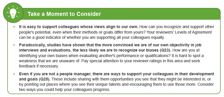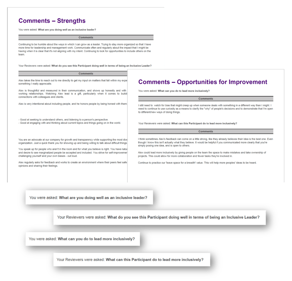 Pure data and Likert scales can only go so far. Therefore, I incorporated an open-text response option for both participants and reviewers at the conclusion of the assessment. These optional questions encourage participants and reviewers to reflect on the participant’s strengths as an inclusive leader and areas where they can improve their inclusive leadership behaviors. These qualitative responses breathe life into the data, offering valuable context to complement the quantitative findings.