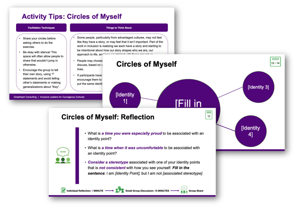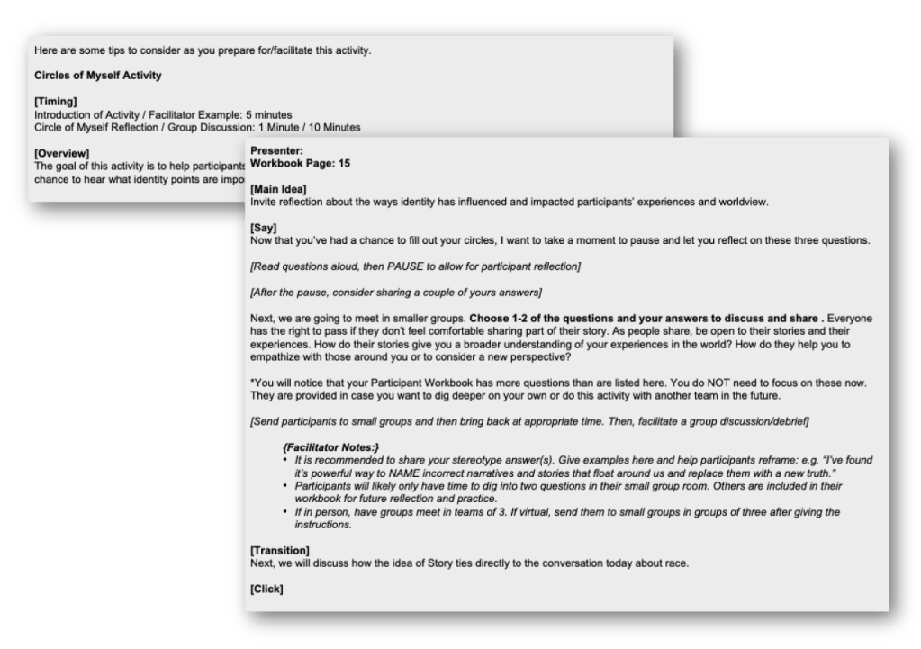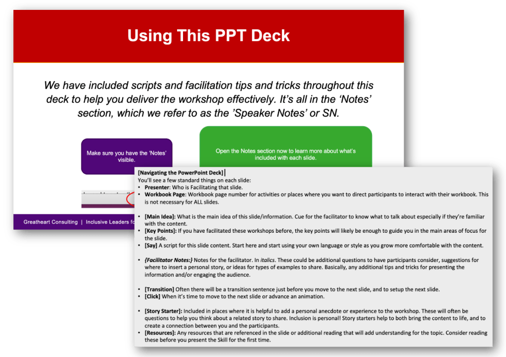 Content is facilitated by both expert facilitators familiar with the content and newly trained Inclusive Leaders Facilitators. For seamless execution, Speaker Notes are provided, offering main ideas, key points, and a script to guide facilitators, regardless of their level of familiarity with the content.