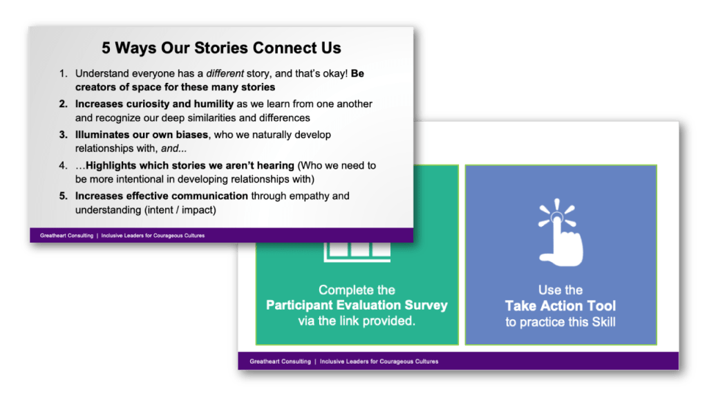 These two slides serve as a review of the day’s learning, emphasizing its significance for participants both personally and professionally. Additionally, they act as a prompt to utilize their Take Action Tools—a document offering suggestions on how to practice their newfound knowledge in the upcoming month. Participants are also encouraged to take the Participant Evaluation Survey, allowing us to gather feedback for further iterations and improvements to the workshop.